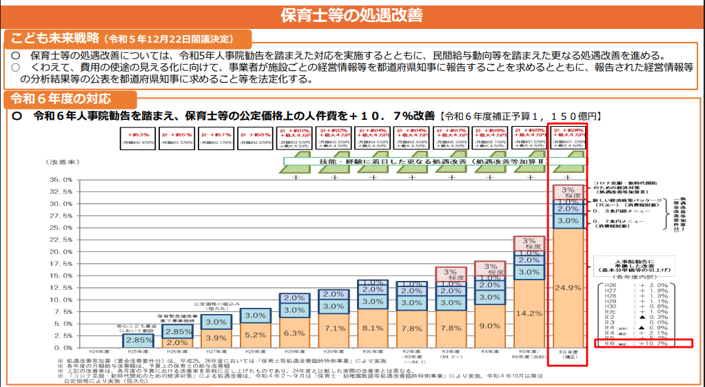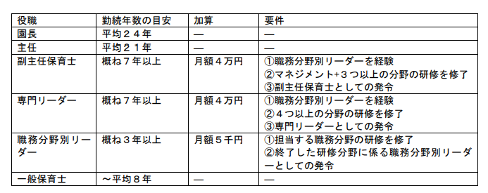 保育園の運営費は国が定める「公定価格」に基づき配分され、人件費に余裕が生じにくいため昇給の幅が小さいのが現状です。