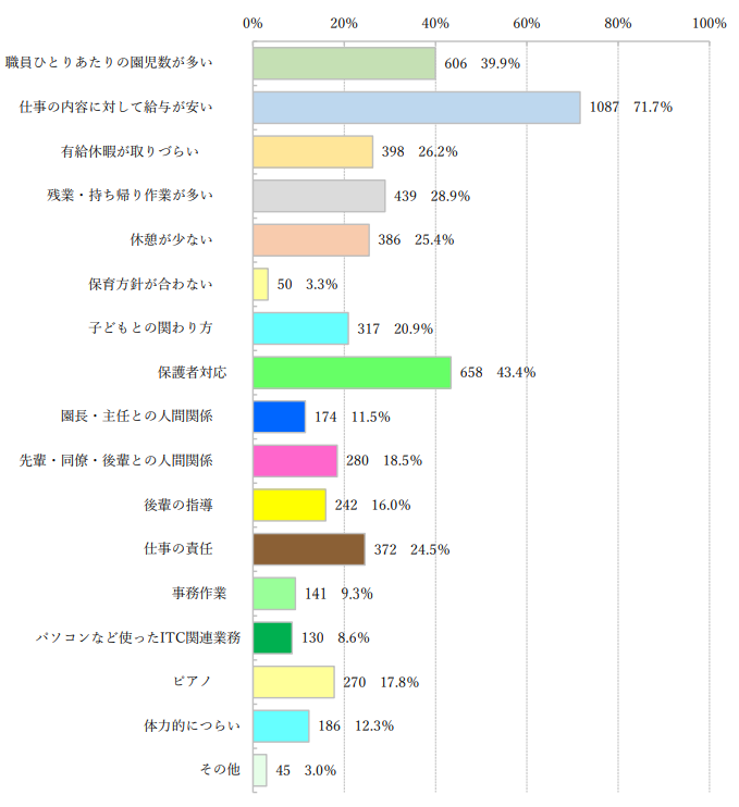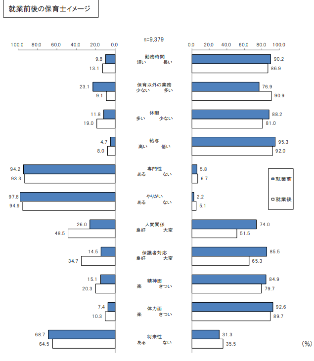 また、就業後は保育以外の業務が多い(就業前76.9%→就業後90.9%)と感じる人が増え、いかに保育士の仕事負担が多いかが分かります。
