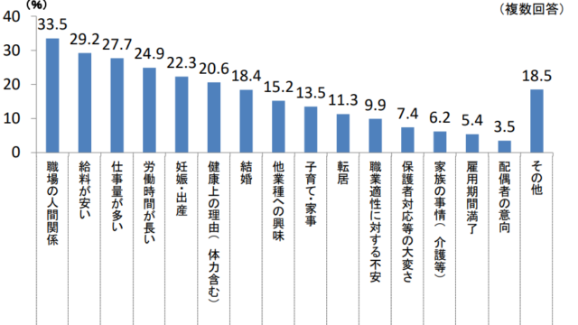 厚生労働省の調査では、退職理由の上位は職場の人間関係、給料の安さ、仕事量の多さが挙げられています。